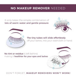 Better hold than waterproof mascaras, yet easier to remove. Just the simple combination of lots of warm water and gentle pressure will slide the tiny tubes effortlessly off your lashes, into your washcloth or hand. No tint or residue is left behind, making it healthier for your eyes and lashes. Don’t forget, makeup removers won’t work.